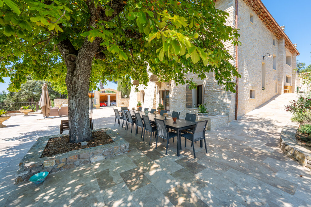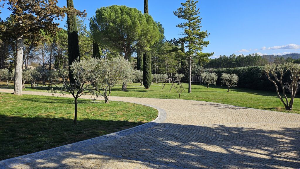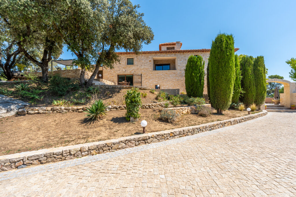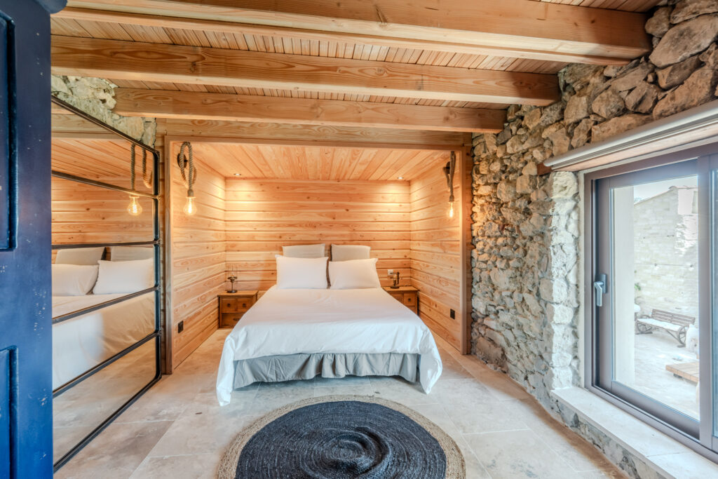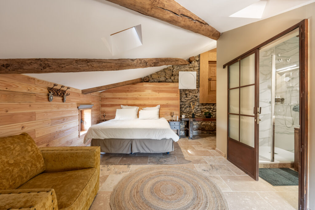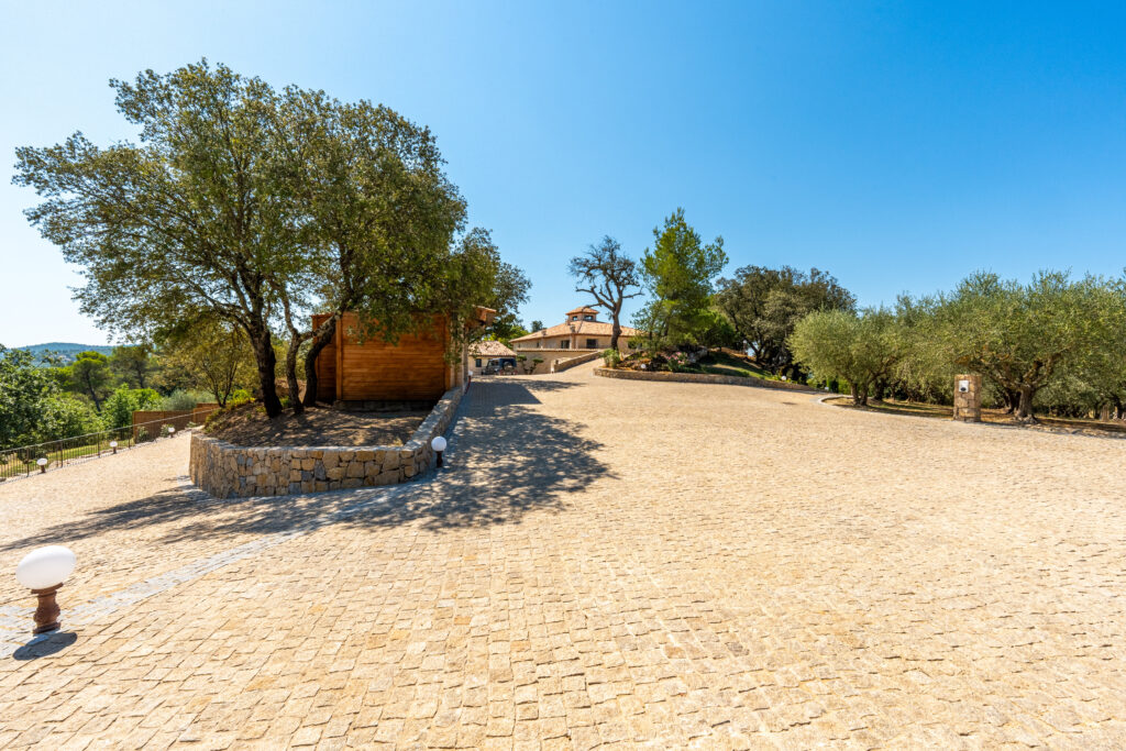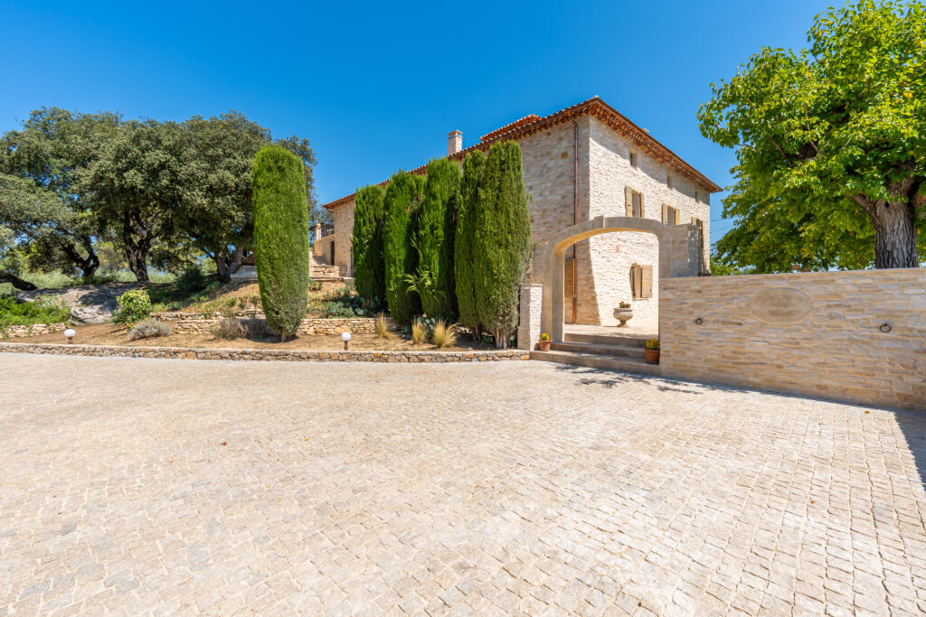 Le domaine abrite également quatre gîtes indépendants, chacun composé de deux chambres et de deux salles de bain, ainsi qu’une seconde piscine généreusement équipée en bains de soleil. Une oliveraie en production, quelques rangs de vigne et un chemin pavé qui relie harmonieusement l’ensemble complètent ce cadre d’exception.