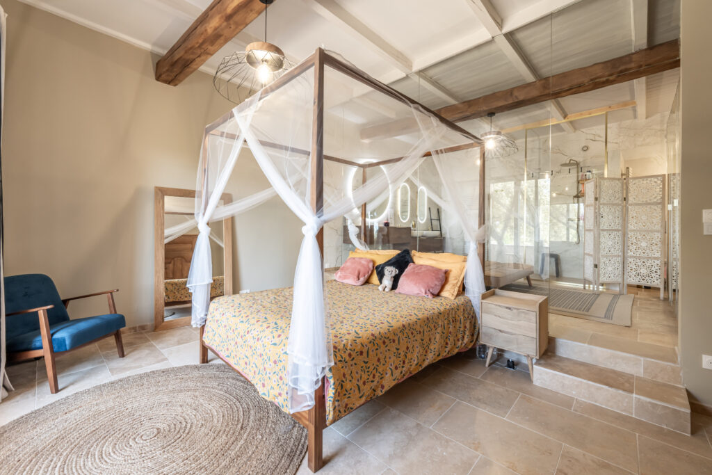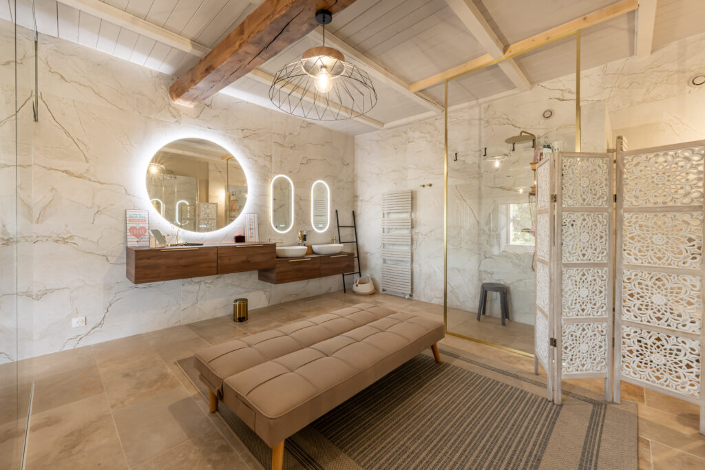 Un intérieur raffiné, derrière ses murs de pierre, la bastide révèle des espaces élégants où la lumière naturelle sublime chaque détail. Les volumes raffinés, les matériaux nobles et le mobilier haut de gamme composent une atmosphère sereine et contemporaine. Chaque pièce a été pensée pour offrir un confort absolu, entre douceur des textures, lignes épurées et ambiance feutrée. Un lieu rare, harmonieux et résolument tourné vers l’art de vivre..