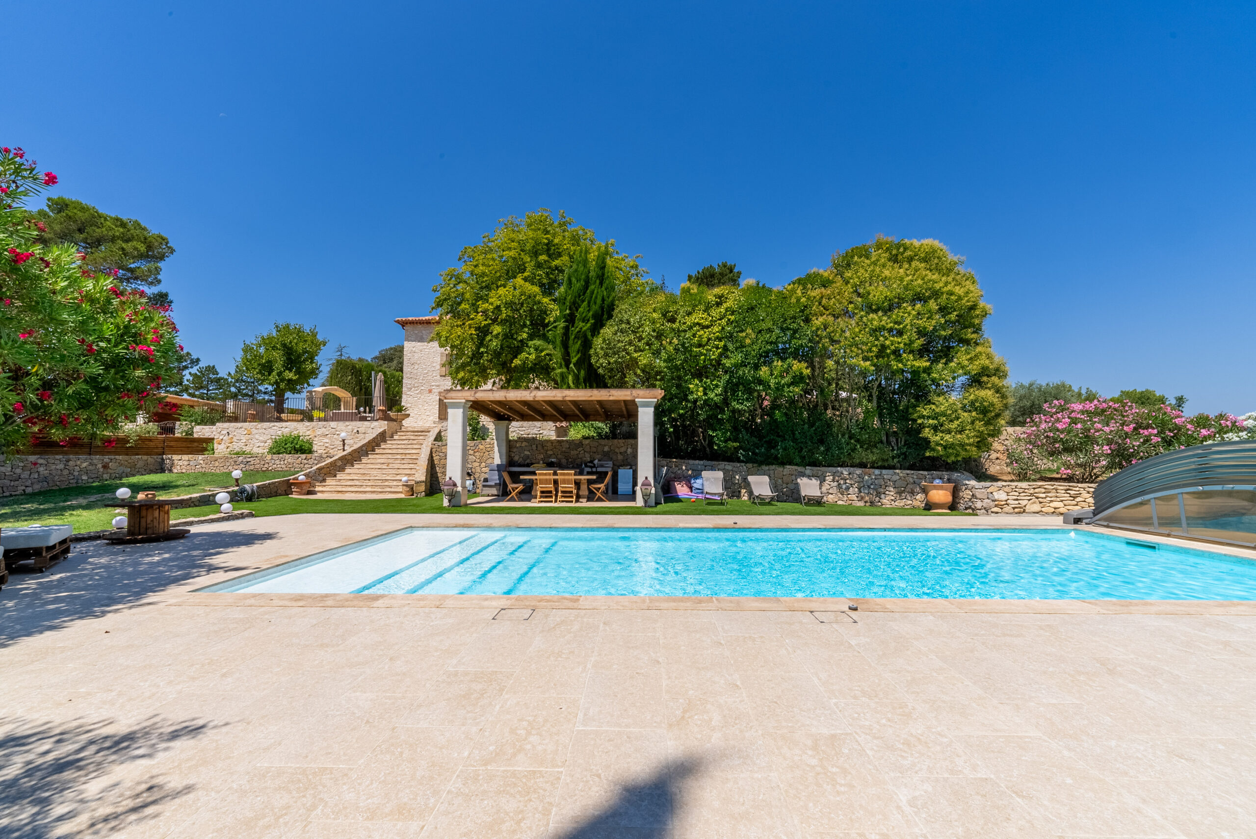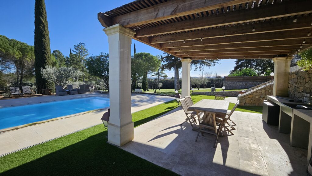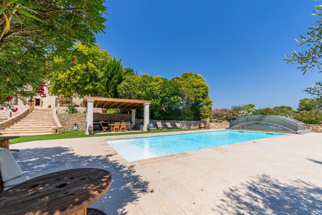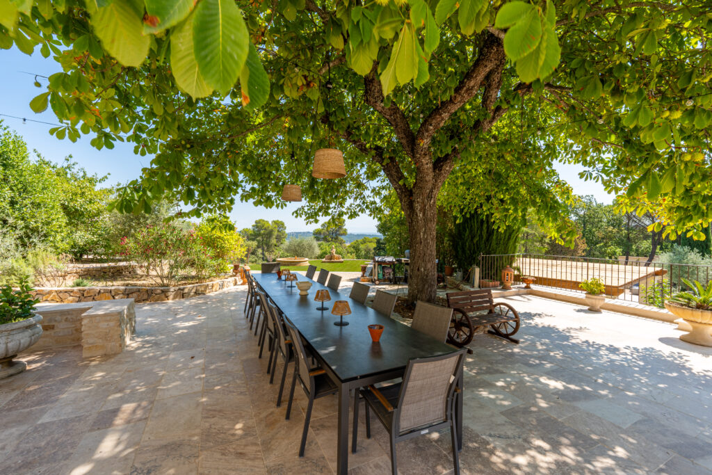 Un domaine préservé, pensé comme une parenthèse de nature et de sérénité. Au cœur d’un parc paysager de 1,6 hectare, la bastide s’ouvre sur de vastes espaces extérieurs où chaque lieu a été conçu pour le plaisir et la détente. En contrebas, une grande piscine entourée de plages aménagées invite au farniente, prolongée par une élégante cuisine d’été et un espace repas ombragé. Plus loin, une large étendue de verdure accueille jeux et moments de liberté, avec balançoire et trampoline pour les plus jeunes.