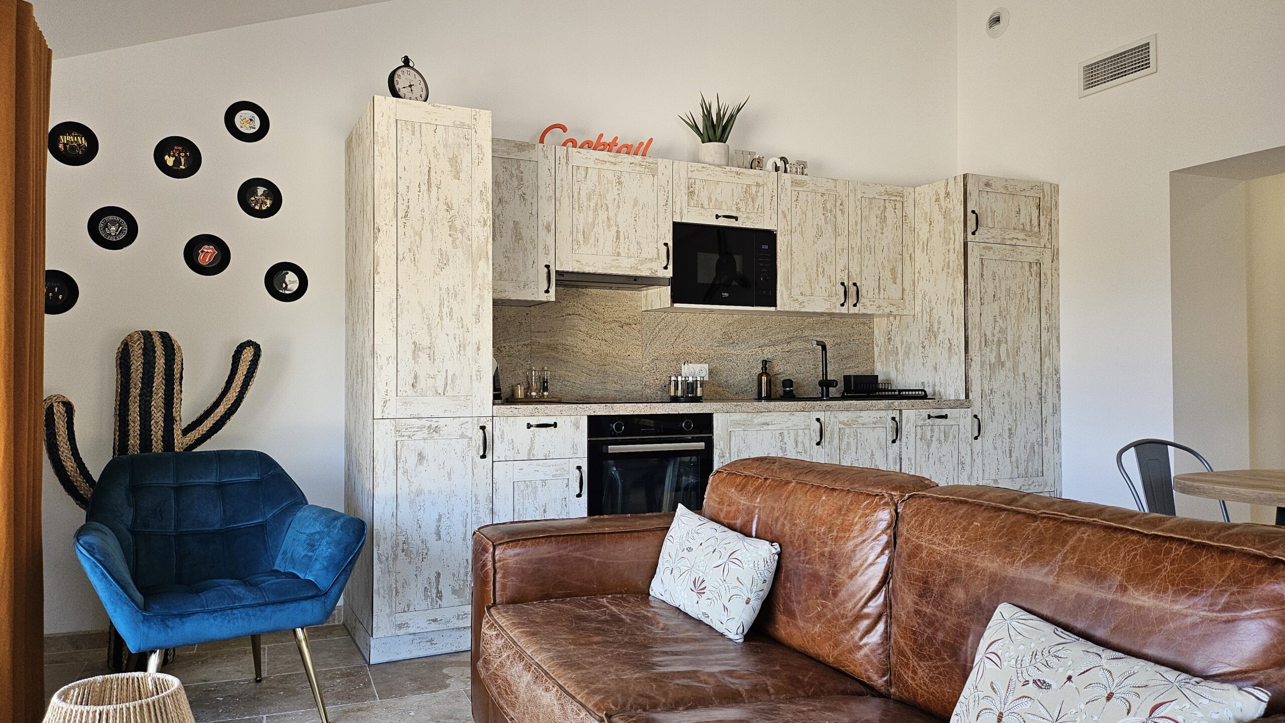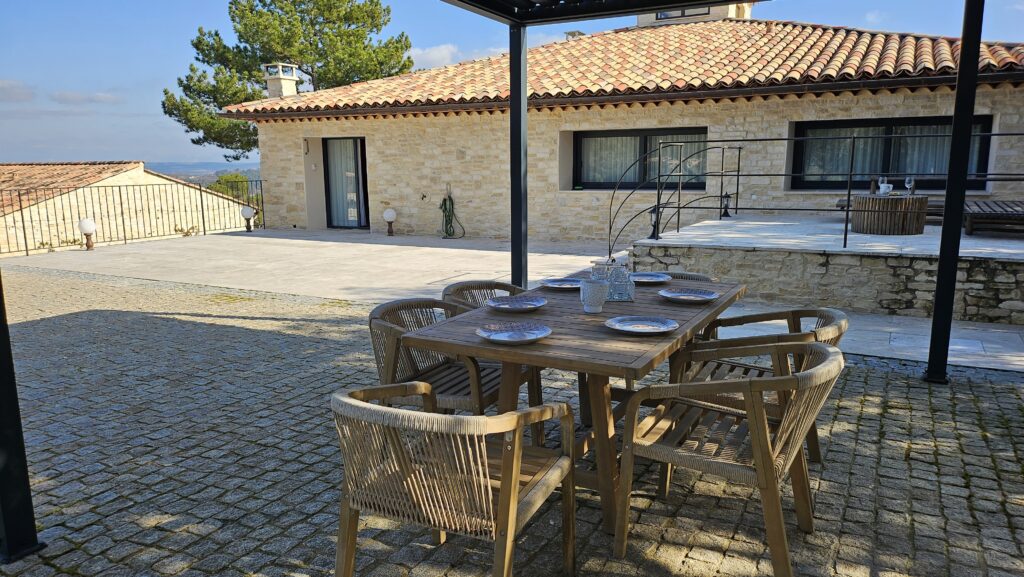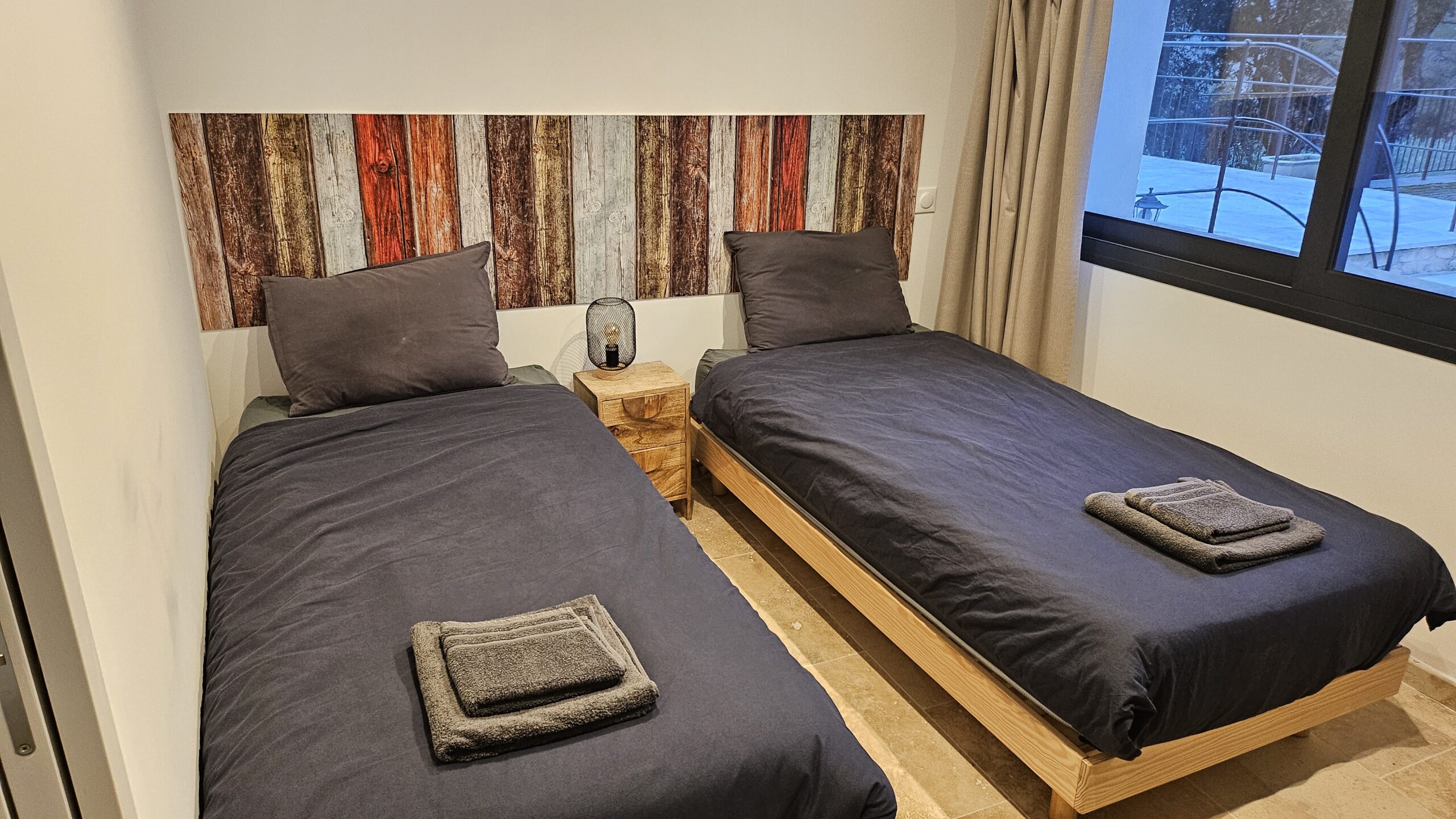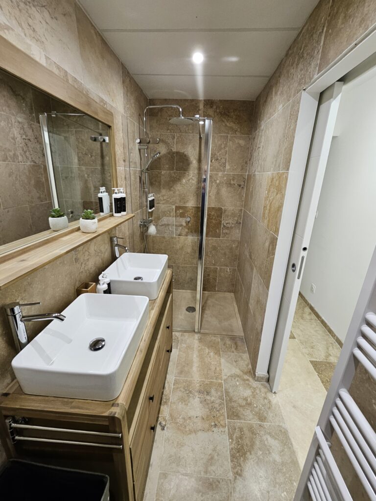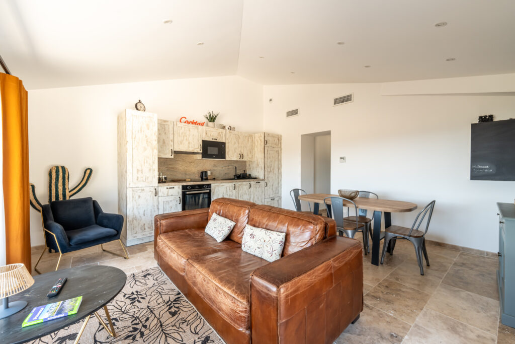 Ce gite est composé d’un salon – Cuisine – Espace repas puis de 2 chambres dont une avec sa salle de bain et son toilette séparé et d’une 2ème salle de bain face à la 2ème chambre. D’un espace extérieur privatif non clôturé de 200m2 avec une salon et un coin repas sous une tonnelle bioclimatique éclairée.