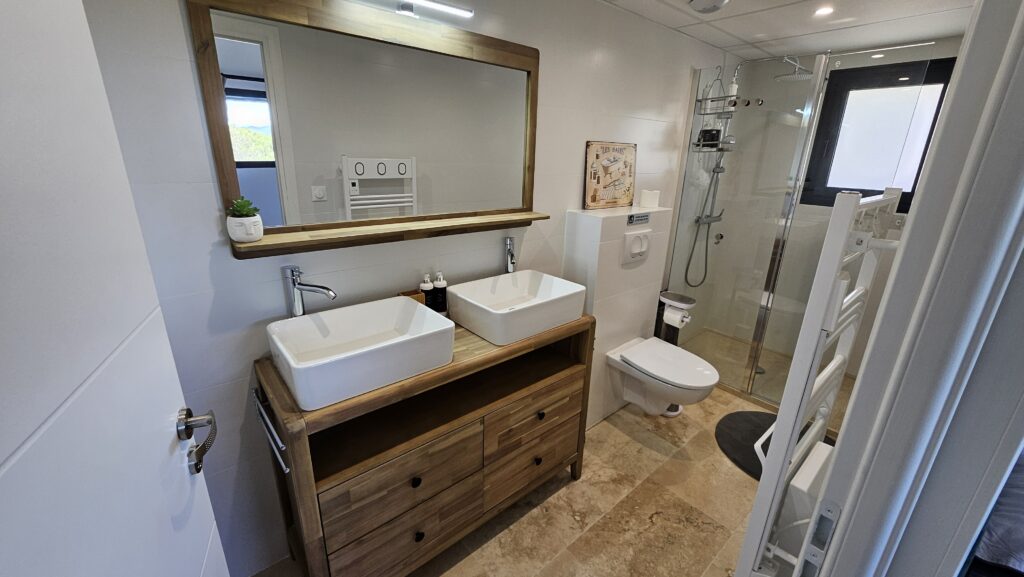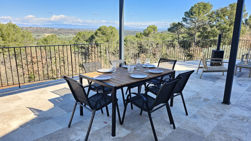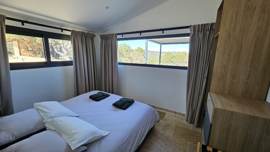Ce gite est composé d’un salon – Cuisine – Espace repas puis de 2 chambres dont une avec sa salle de bain et son toilette séparé et d’une 2ème salle de bain avec un toilette. D’une terrasse extérieur privative non clôturé de 70m2 avec un coin repas sous une tonnelle bioclimatique éclairée qui domine les vallées du Verdon.