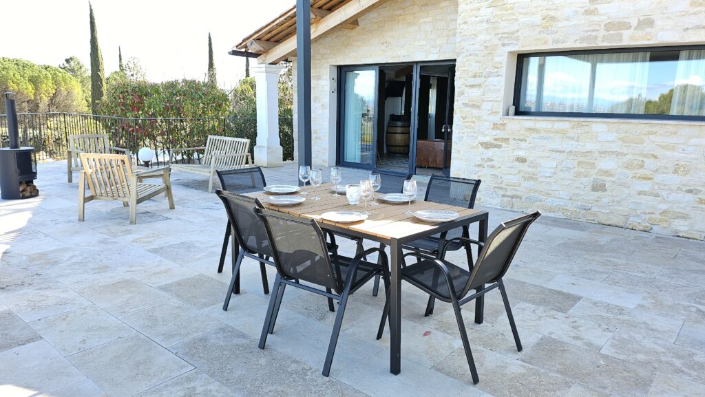 Equipé d’un coin salon avec un bras zéro et d’un coin repas sous une tonnelle bioclimatique éclairée.