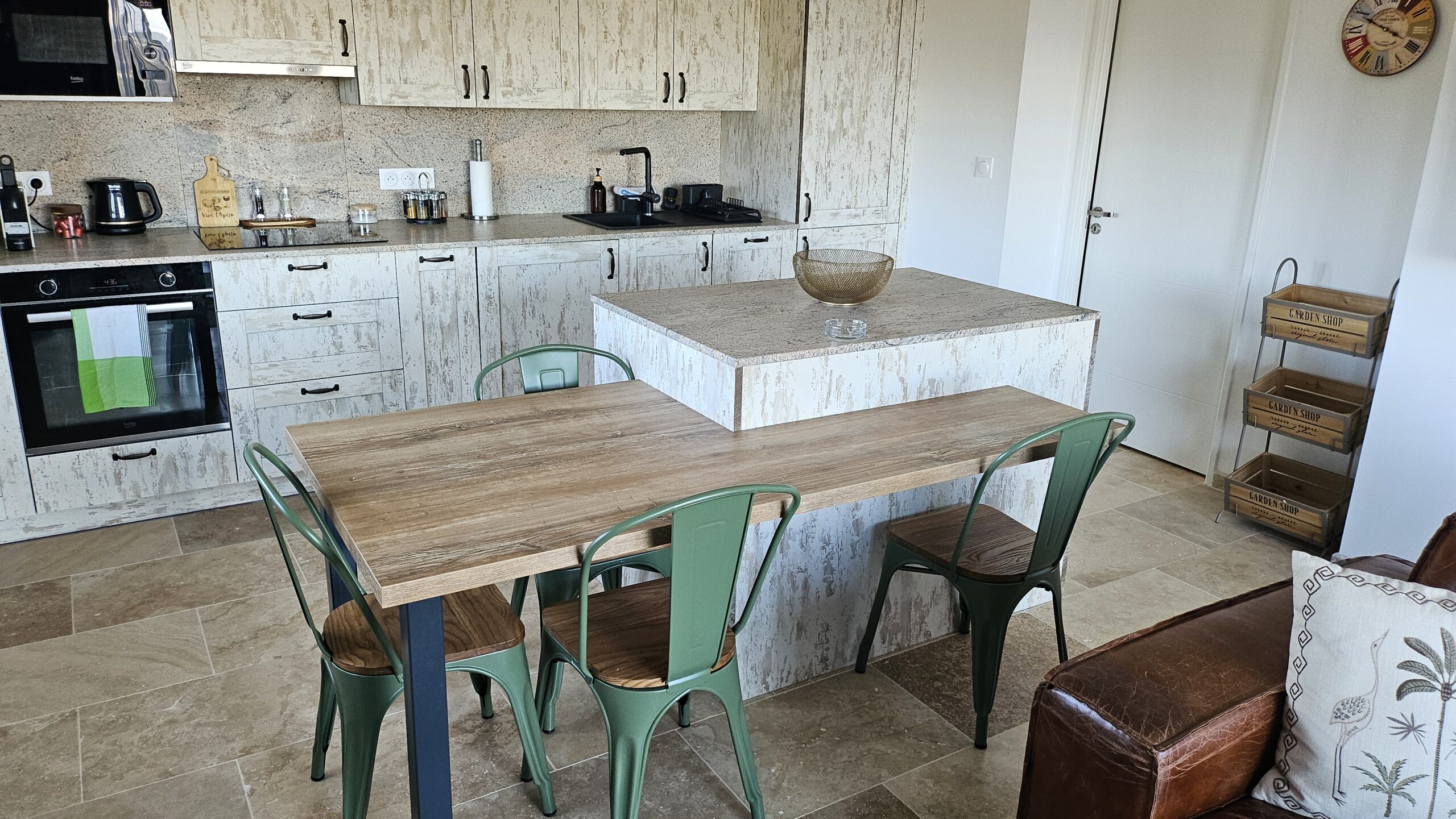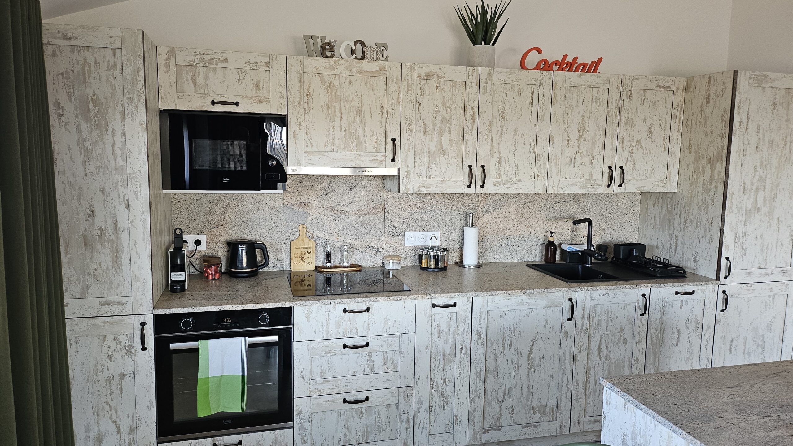 Entièrement équipée, Lave vaisselle, lave linge, Frigidaire, congélateur, four, micro-onde, Cafetière Nespresso, Bouloire…